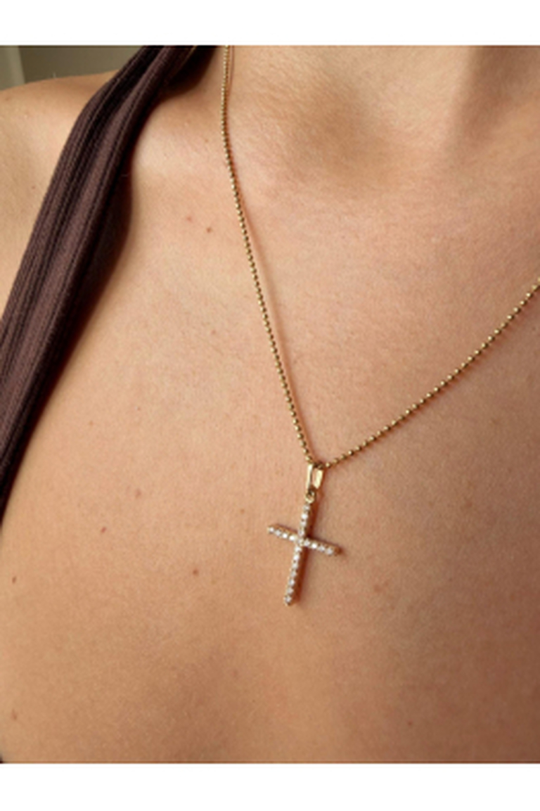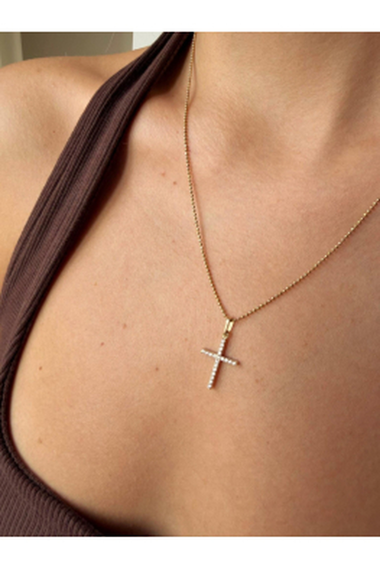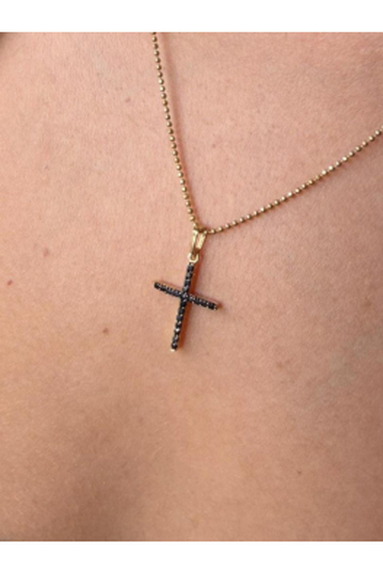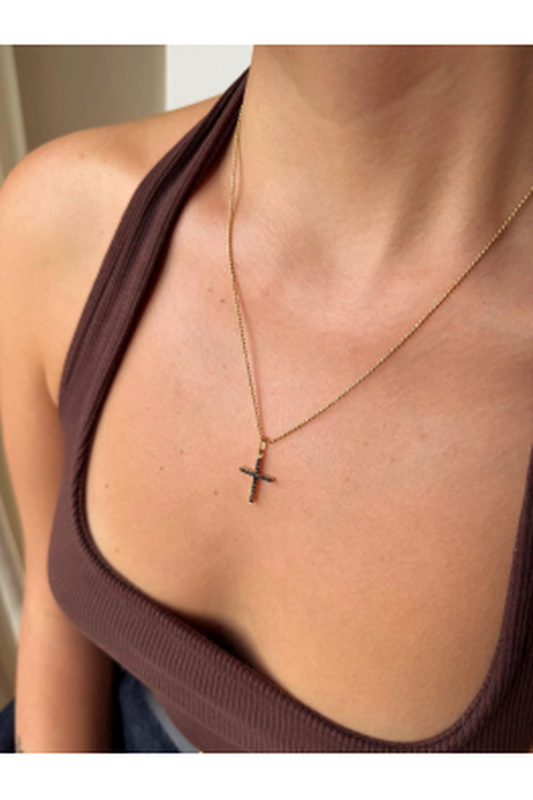 This 14-carat (14K) pure gold cross necklace with zircon stones is double-sided. One side is adorned with black zircon stones, while the other side features white zircon stones—both sides can be worn!