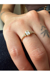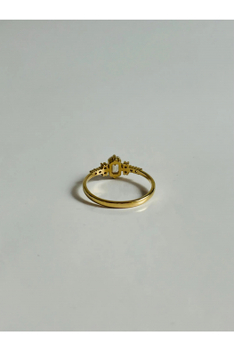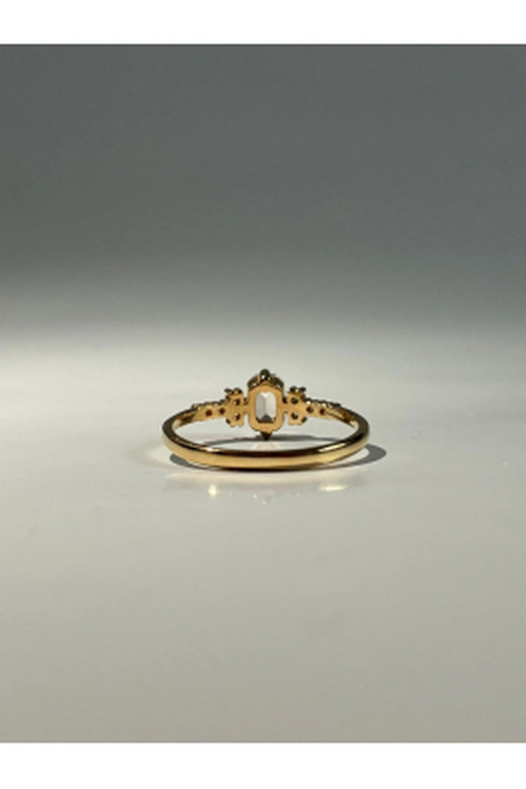 This 14-carat (14K) solid gold multi-stone ring features 8 round-cut small zirconia stones and 1 emerald-cut zirconia center stone.