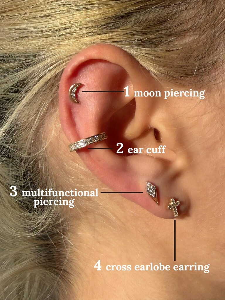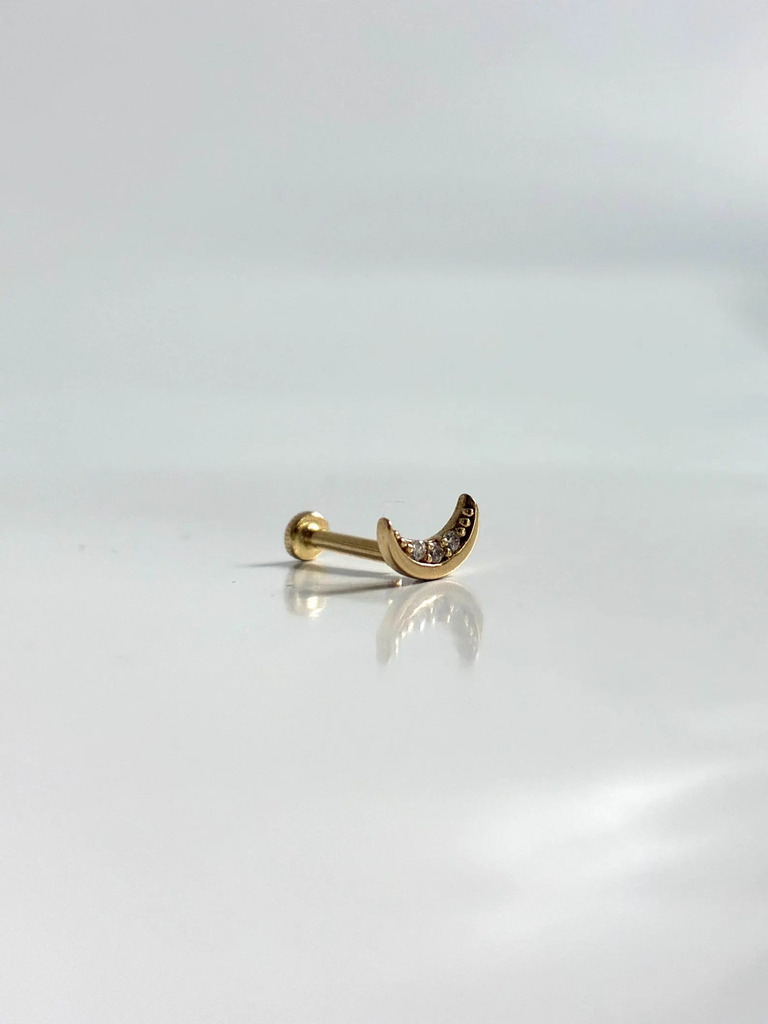 This Moon piercing you can wear on upper lobe, earlobe, helix, conch or tragus. Back closure is screw back. The weight is 0,35 gr. It is made of 14k solid gold and zircon stones.