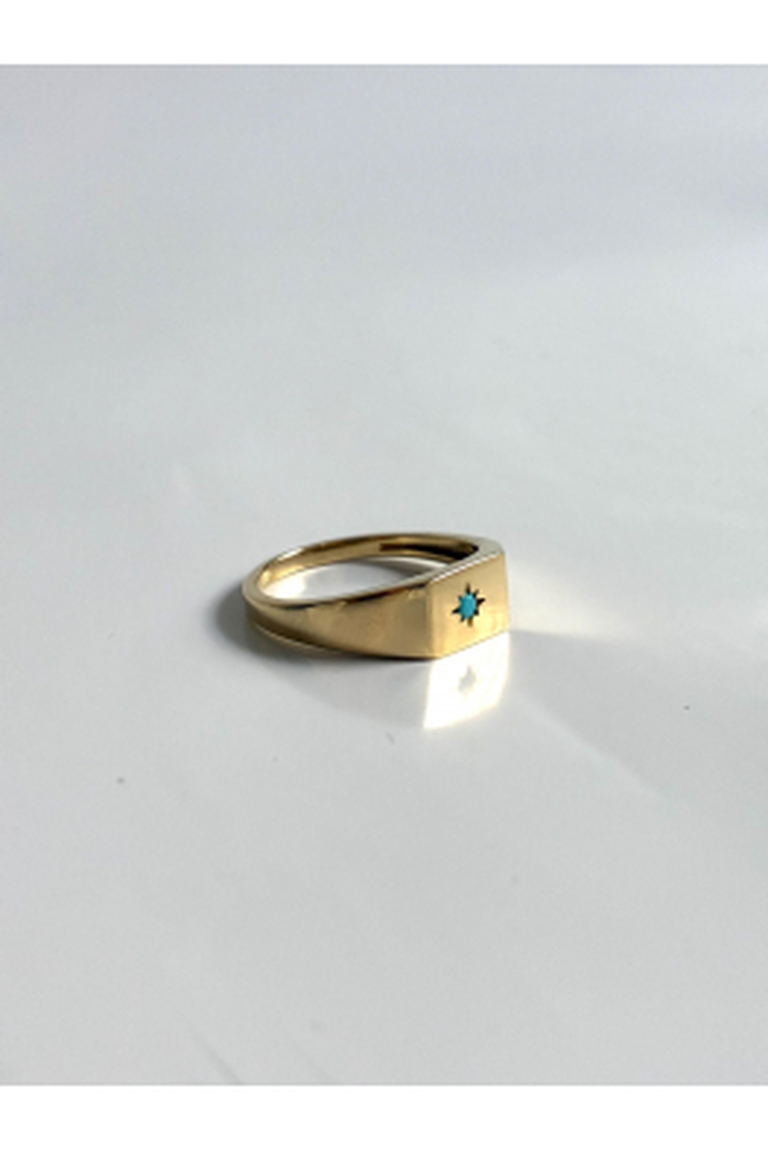 This gold rectangular signet ring is crafted from genuine 14-carat (14K) solid gold. It features a rectangular face at the front, with a hand-engraved, polished star design at the center. A blue stone is set in the middle of the star.