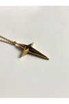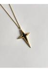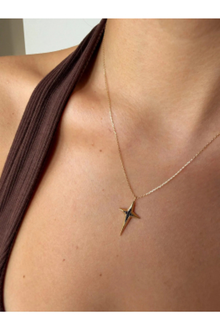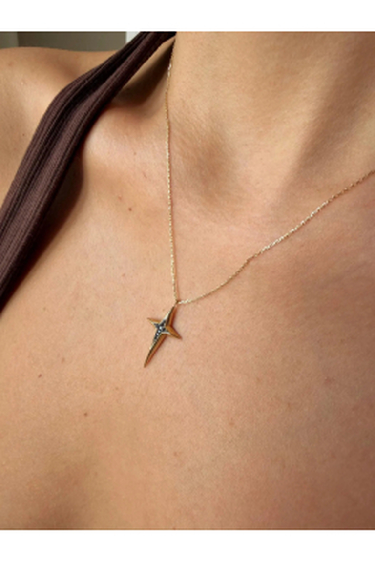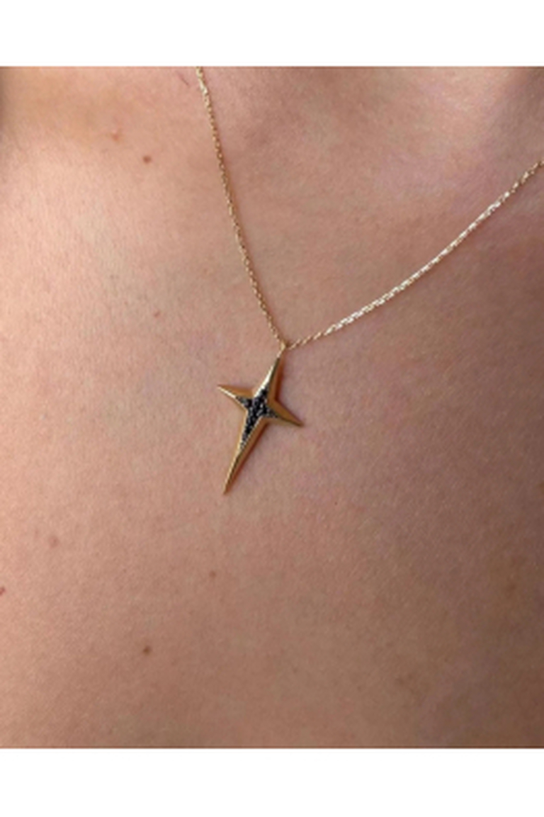 This 14-carat (14K) solid gold North Star necklace is adorned with black zirconia stones.